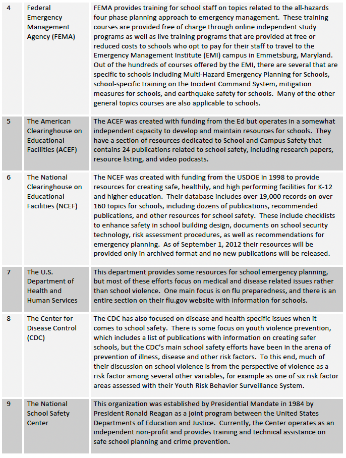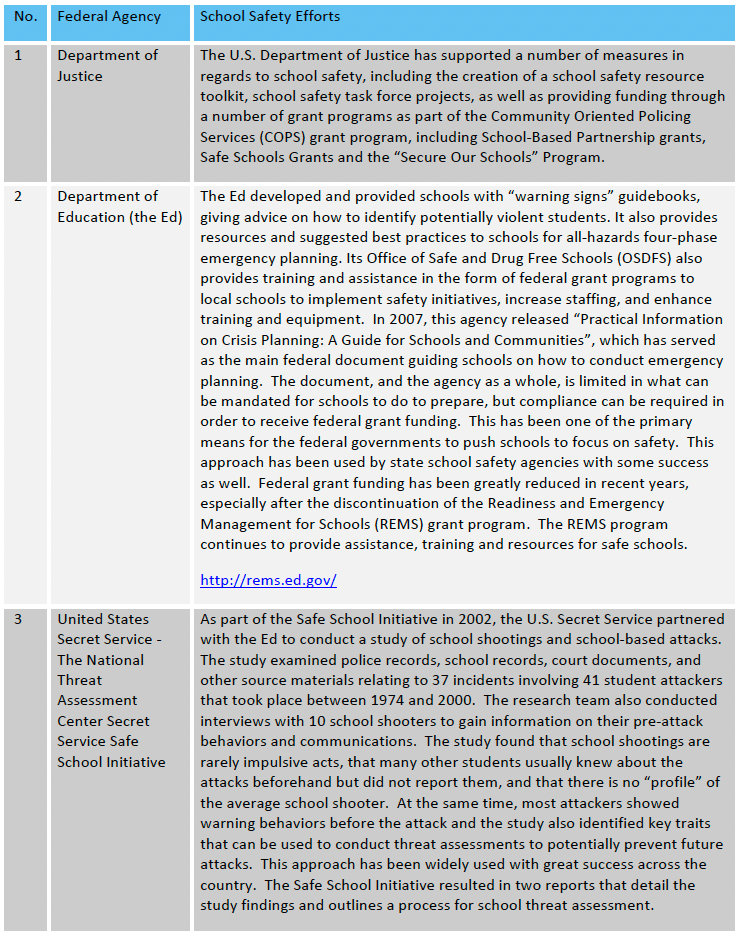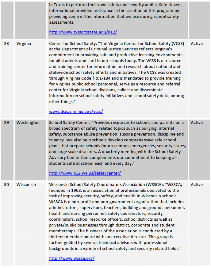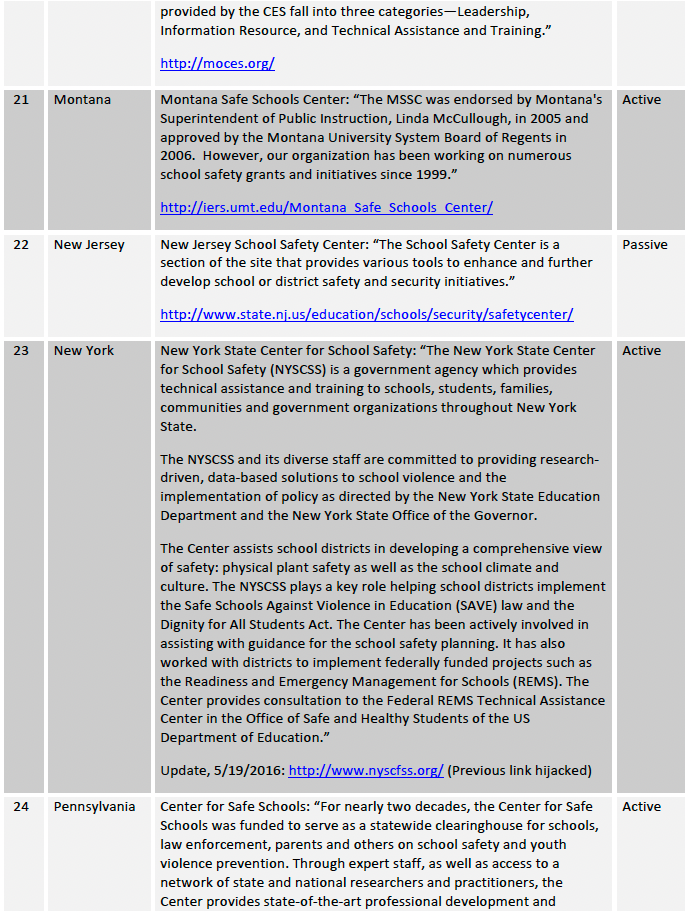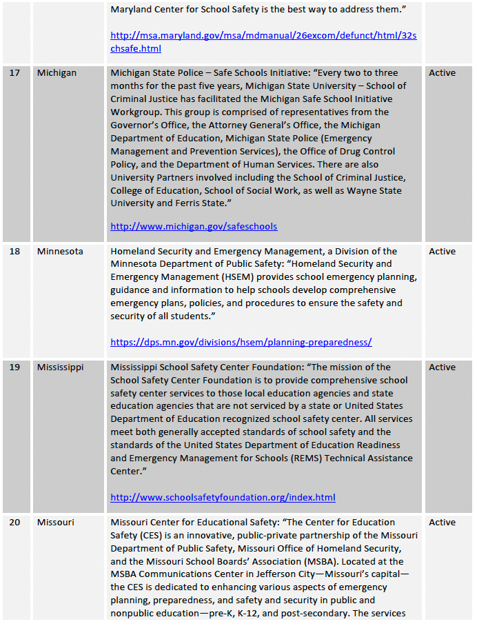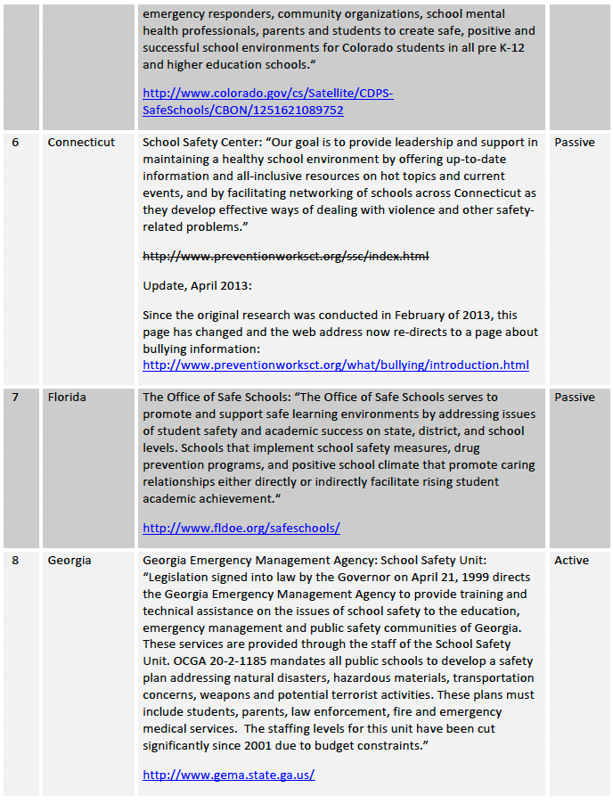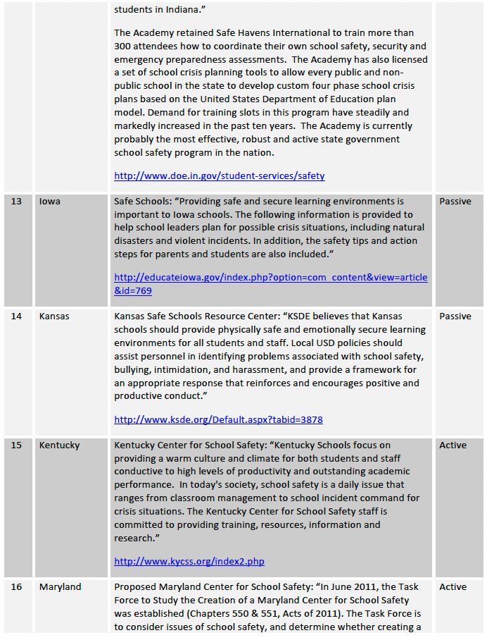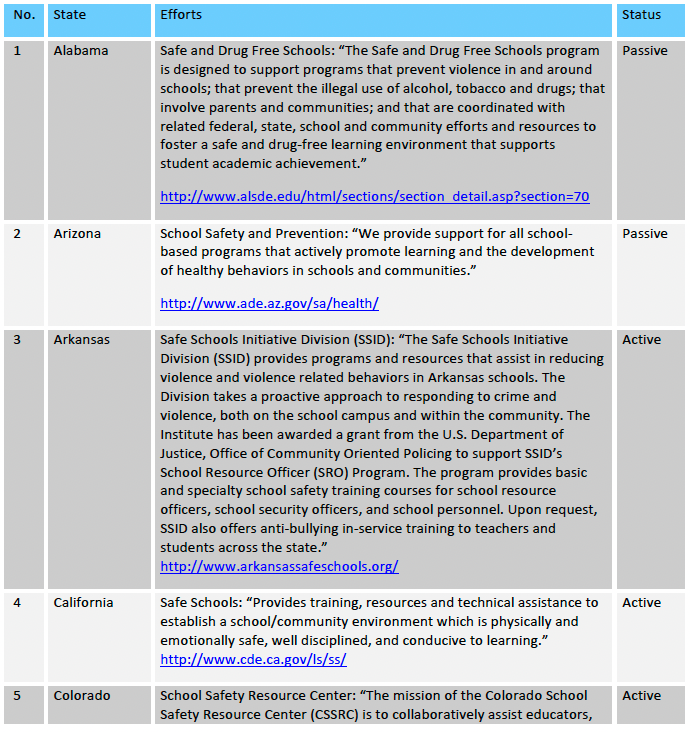 Most state agencies have also conducted school safety efforts. Below is a review of the efforts by the primary agencies responsible for education and safety in different states. We classify these efforts as “passive” and “active”. Passive efforts are those on which a state agency may make resources available to those seeking them or offer minimal training to those interested. Active efforts are those that are required and may include certification. The efforts of each state are up to the states to decide. A state may have established passive efforts because it feels that more active measures are not needed.