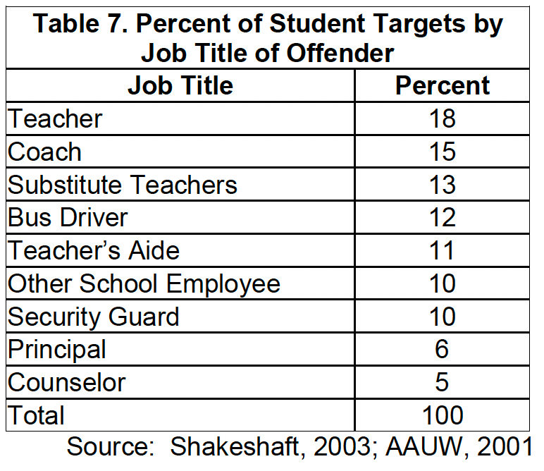 Table 7 shows the breakdown of the perpetrators by job titles. Dr. Shakeshaft wrote that teachers who spent individual time with students, such as music teachers and coaches, were more likely to engage in educator sexual misconduct.