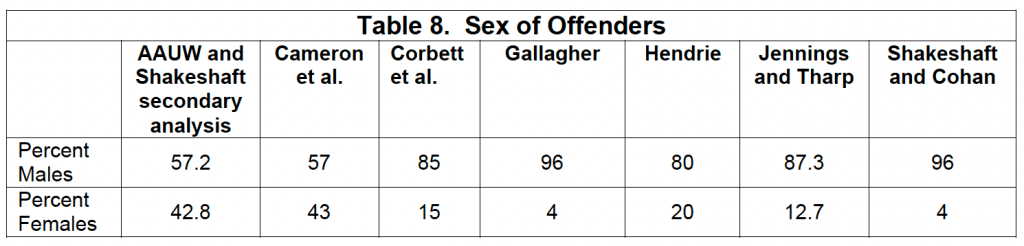 Table 8 shows the breakdown by sex of the offender. With the exception of the Gallagher Study (Gallagher, 2002), Dr. Shakeshaft notes that the findings are in contrast to the research on child sex abuse in general. The findings show that 90 to 98 percent of females and 18 to 86 percent of males are sexually abused by a male (Finkelhor, 1985).