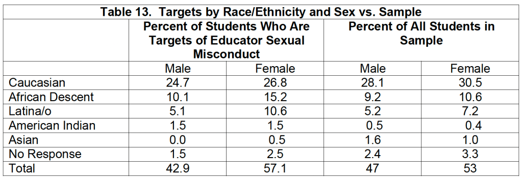 Table 13 shows the percentage of students by race and sex who report having been targeted by an employee of a school district. Females, particularly females of color, are overrepresented as targets of educator sexual misconduct with regard to their proportion of the population. Dr. Shakeshaft writes, “Females are 53 percent of the sample and 57 percent of the targets of educator sexual abuse. Females of color are 18.2 percent of the sample and 27.3 percent of those targeted” (Shakeshaft, 2004).