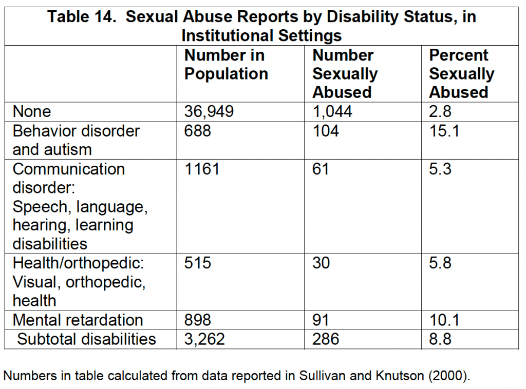 Dr. Shakeshaft also looked at students with special needs. She found even less data than for general education students, but she was able to calculate that, “8.8 percent of students with disabilities vs. 2.8 percent of students without disabilities were sexually abused. Students with behavior disorders are more than five times as likely as non-disabled students to be sexually abused, with mentally retarded students more than three times as likely” (Shakeshaft, 2004).
