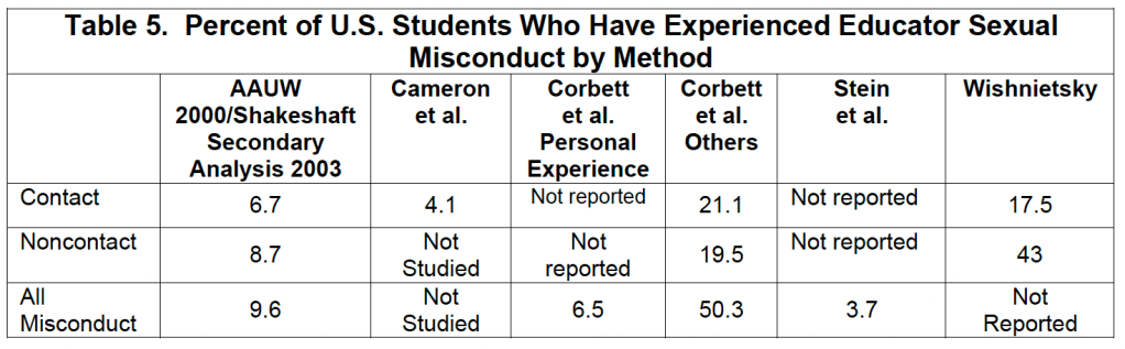 The table above shows the prevalence found in the various studies. Dr. Shakeshaft wrote, “Because of its carefully drawn sample and survey methodology, the AAUW report that nearly 9.6 percent of students are targets of educator sexual misconduct sometime during their school career presents the most accurate data available at this time,” (Shakeshaft, 2004).