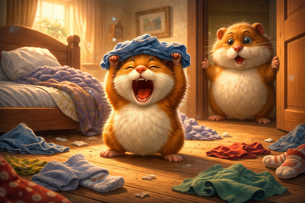 Soon, all three are running around the room, picking up clothes and putting them where they belong. In no time, the room has been picked up. The three started arguing over who did it best and ended up wrestling on the floor, laughing.