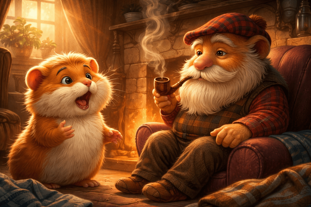 Haimish found his da in the living room, smoking his pipe in front of the fireplace.